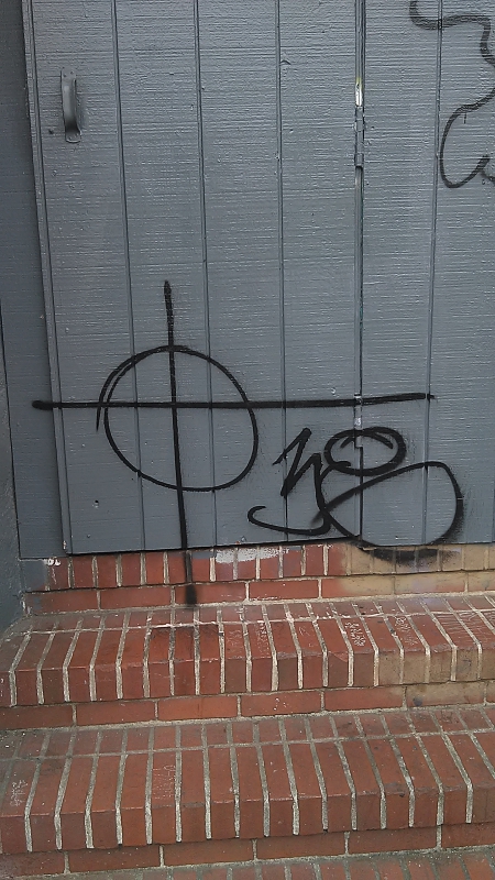 We personally began to see an SS tag start appearing in Berkeley and North Oakland at the beginning of the Ferguson rebellion in Nov.-Dec 2014. Since then, they have appeared consistently along Telegraph Avenue in various locations. The tag in question consists of an SS symbol with an upside down cross hanging above it. While this may have some association with the white metal scene, we consider it a fascist symbol and considers the taggers to be fascists as well.